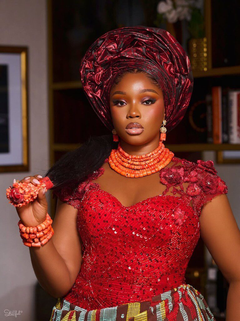Enjoying the function of Achalugo, the bride within the film, Bambam’s outfit completely mirrored her on-screen character’s class and energy. The star actress selected a fitted crimson lace high that highlighted her determine superbly. The colour crimson spoke volumes, ardour, love, and glam, every part her character represents.