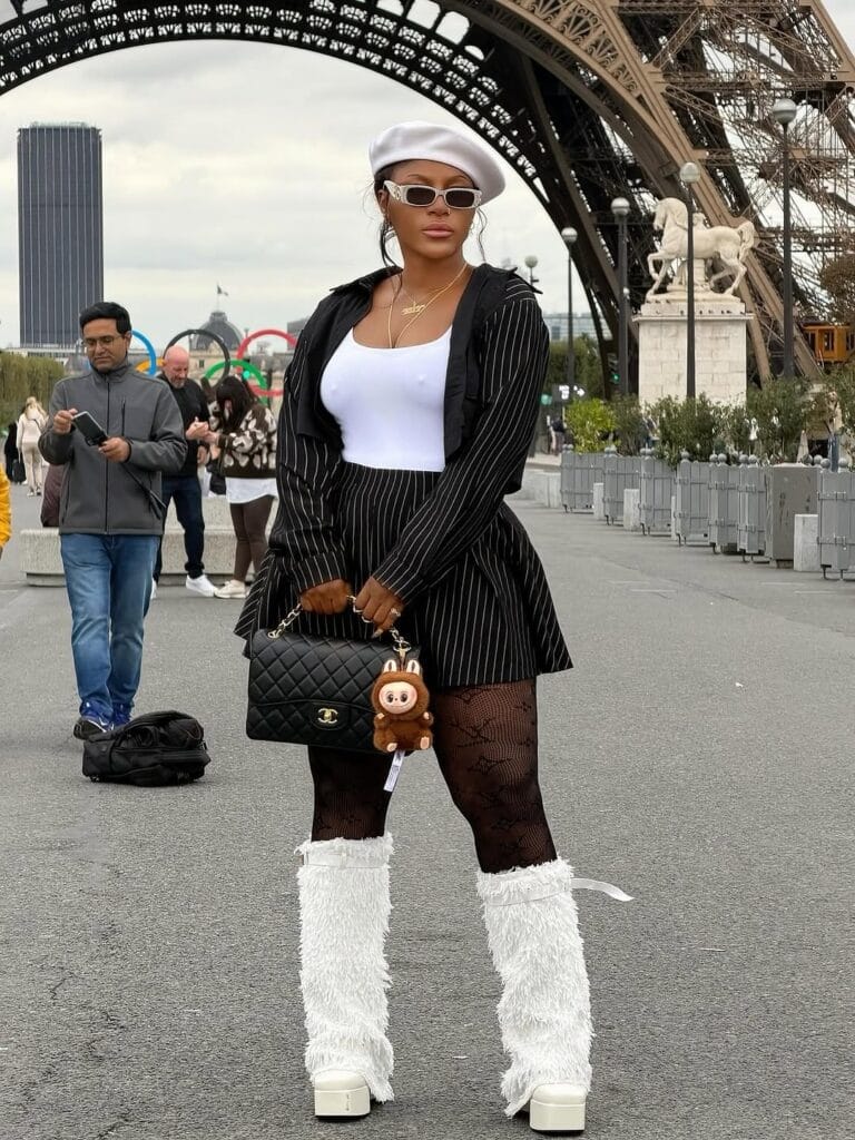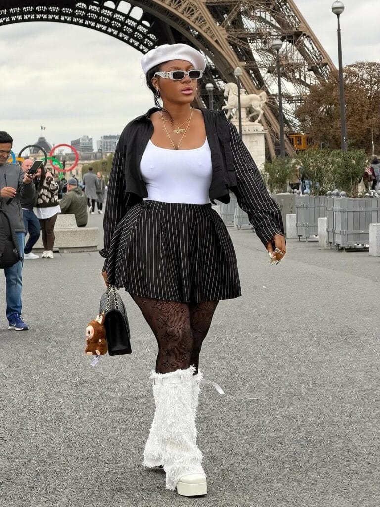 Her platform furry boots steal the present. The plush white design provides each drama and heat, turning the traditional black-and-white outfit into one thing runway-worthy. The peak from the platform sole provides size to the legs, whereas the fuzzy element softens the general look. She finishes with a black quilted purse, holding the outfit balanced and fashion-forward.