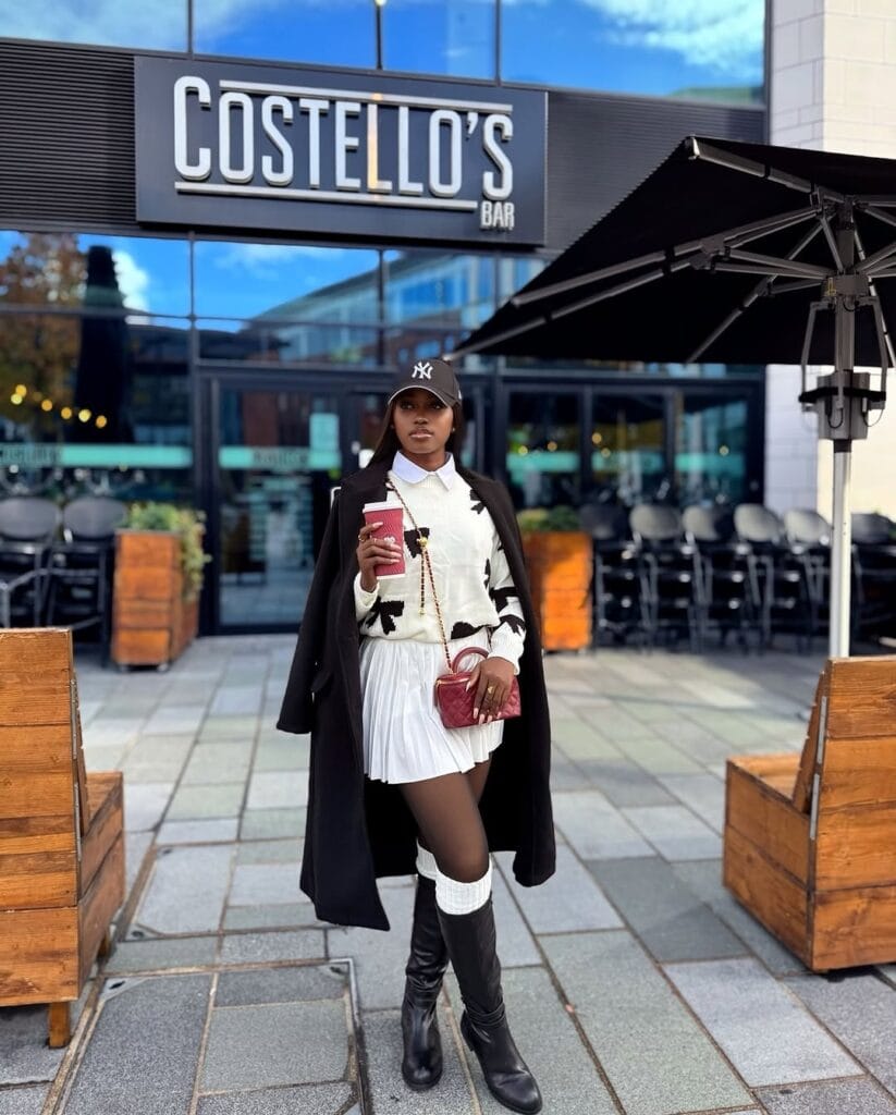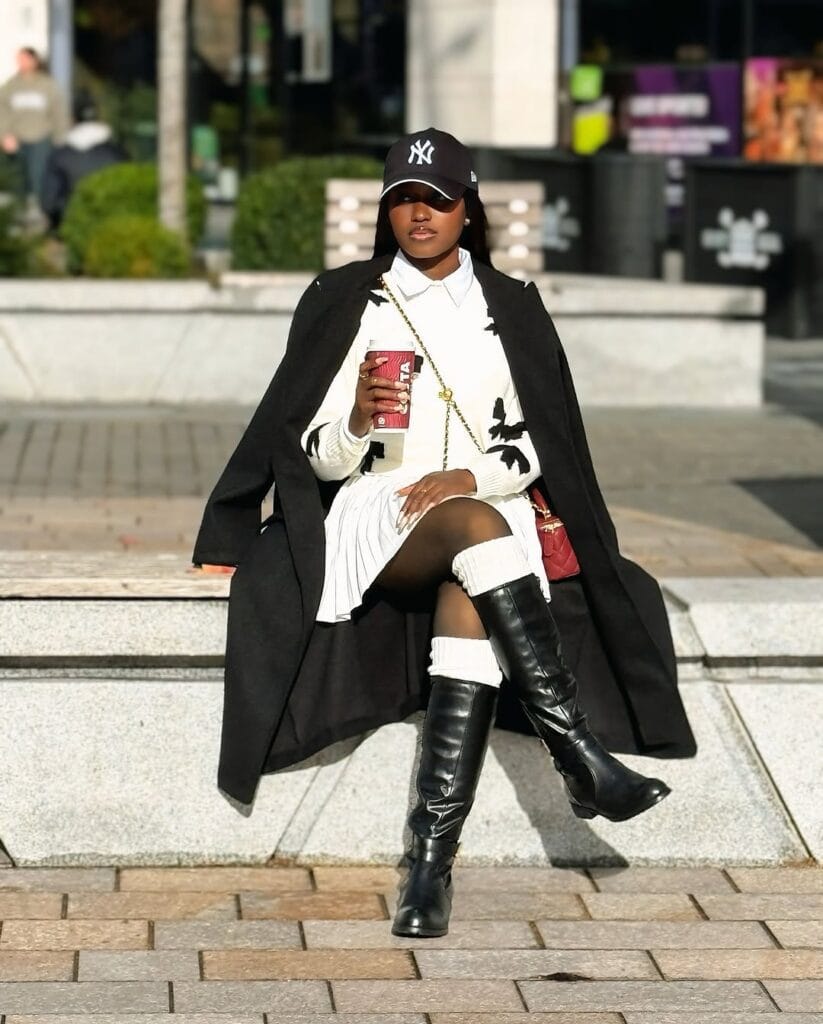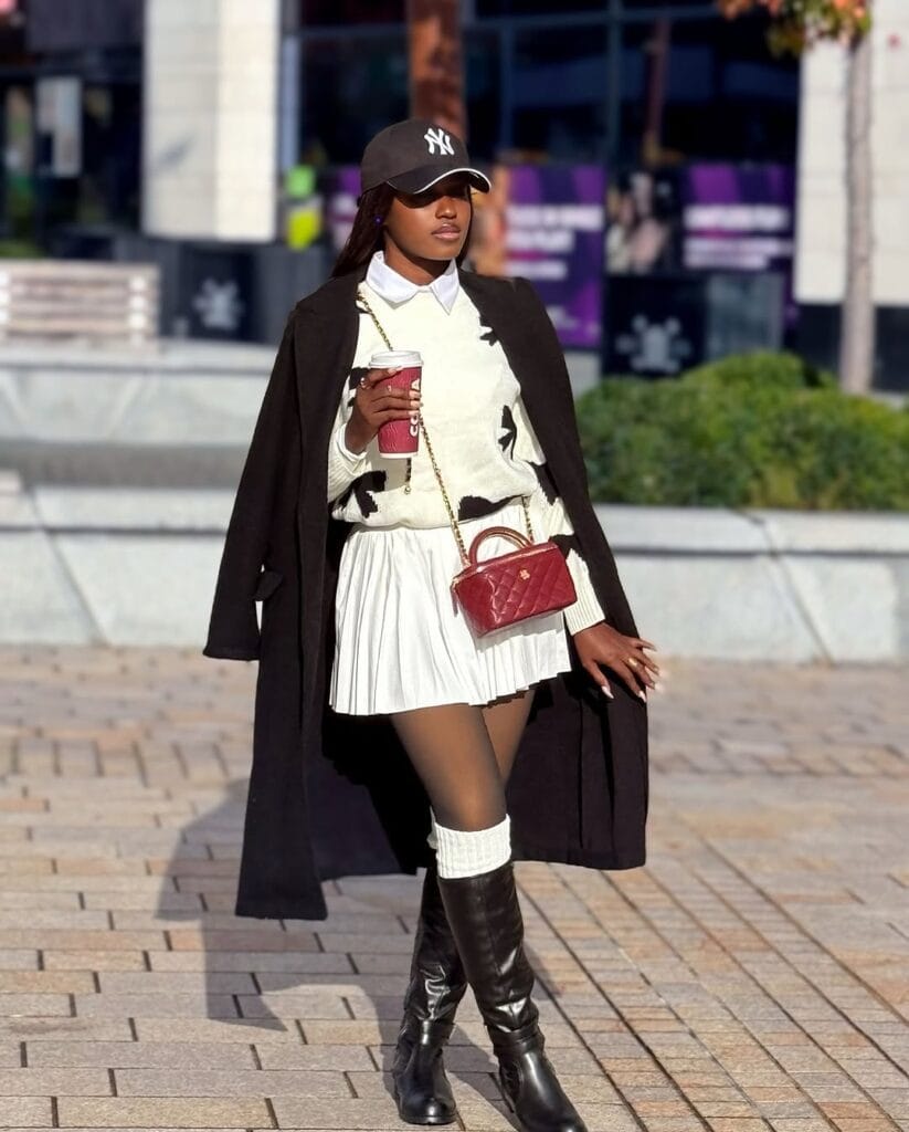 To tug all of it collectively, she throws on a protracted black coat that immediately provides some boss vitality. After which comes the true assertion, her knee-high leather-based boots. Modern, fitted, and tremendous trendy, they steadiness out the playful skirt and make the look really feel put-together.