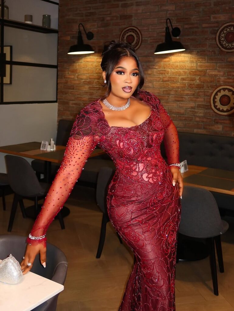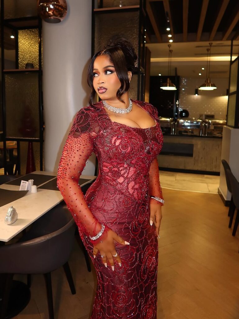 Imisi Introduced the Glam in Burgundy Lace and Swarovski Sparkle on the BBNaija Winner’s Social gathering