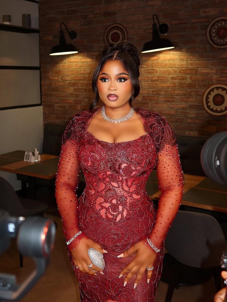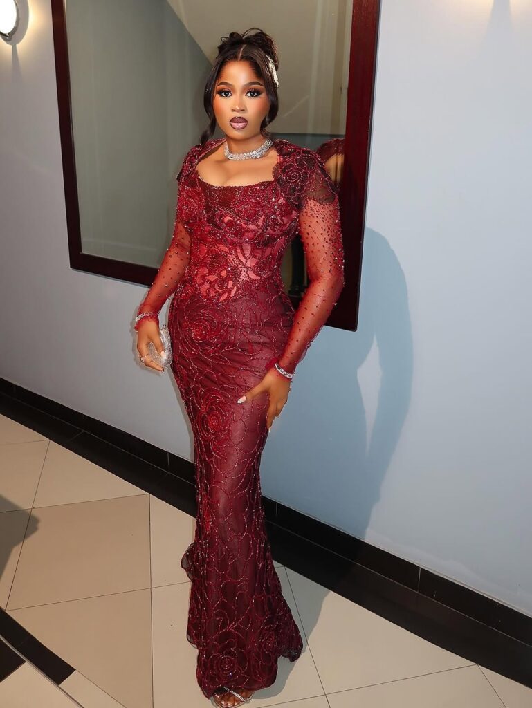 The BBNaija Winner’s Social gathering had its justifiable share of glitz, however the true highlight second got here when Imisi arrived. Her entrance was a pure show of magnificence, a deep burgundy lace robe that caught each flash of sunshine, sprinkled with Swarovski crystals that gave her a gentle, radiant glow.