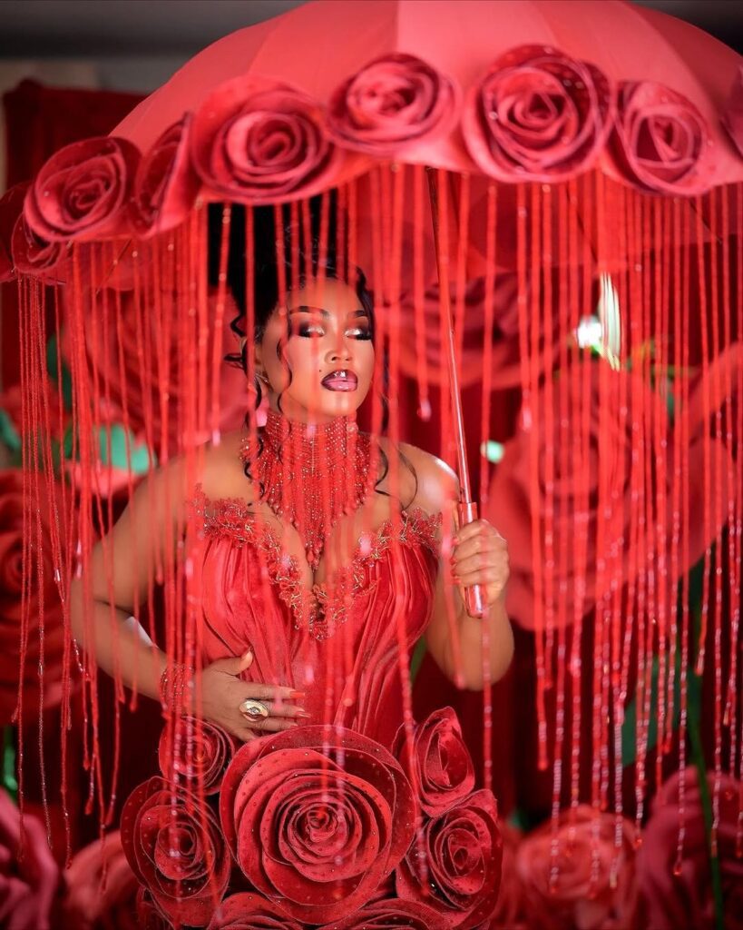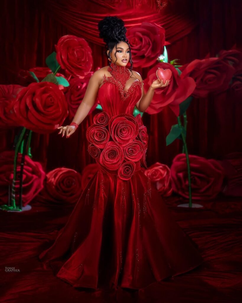 This Mercy Aigbe rose robe featured a fitted higher half with a heart-like form round her waist that fantastically flattered her curves. From the hips right down to her knees, the robe shaped sculpted rose patterns earlier than flowing dramatically to the ground. Each element spoke of creativity, precision, and pure luxurious, the type of craftsmanship that makes a crimson carpet worthwhile.