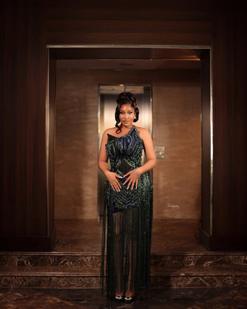 Let’s speak about this sleeveless mini gown with a shine from each angle. The material shines with its intricate weave of shiny materials, and the addition of strings of beads provides it an additional contact of class. And the fringed hemline strikes so superbly with the motion, making each spin and twirl a efficiency.