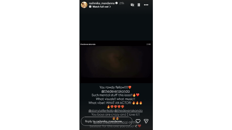 Taking to her Instagram tales, Rashmika Mandanna reposted the announcement and expressed her pleasure for the challenge. Praising the visuals, music and general vibe, whereas additionally applauding Vijay Deverakonda’s efficiency, Rashmika wrote, “You rowdy fellow!!!! @thedeverakonda. Such psychological stuff this issss!! What visuals!! What music!! What vibe!! WHAT AN ACTOR!”