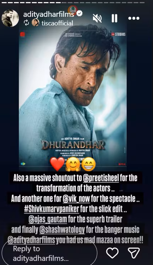 Replying to him, Aditya wrote, “Thanks Vikku!! Tu Bhi Mere Dhurandhar Hai!!”