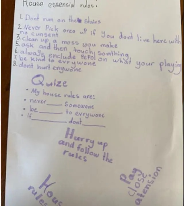 On the backside of the web page, she wrote encouraging reminders akin to “Hurry up and comply with the foundations,” “Home guidelines,” and “Pay shut attension.”