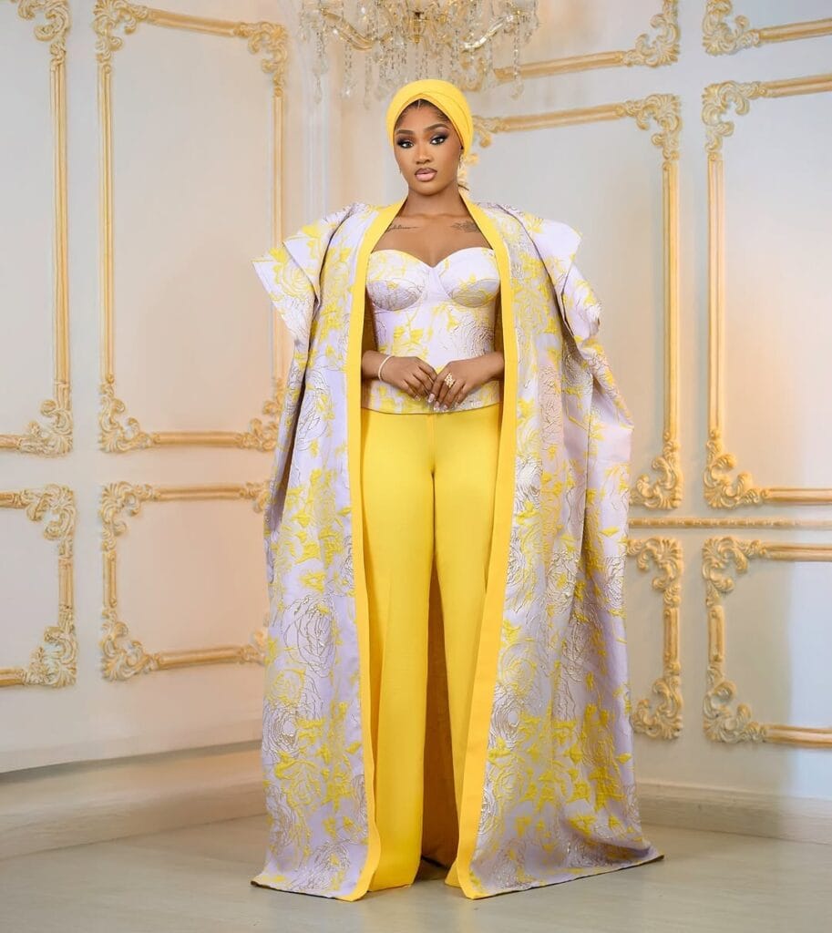 And simply after we thought we’d seen all of it, she introduced again traditional class with a yellow and white three-piece outfit that radiated grace. The set featured a sweetheart corset high, high-waisted trousers, and a floor-length brocade coat with yellow floral patterns and structured shoulders. Her neatly tied gele and gentle, understated equipment added the right of completion.