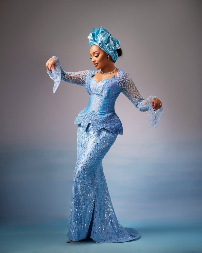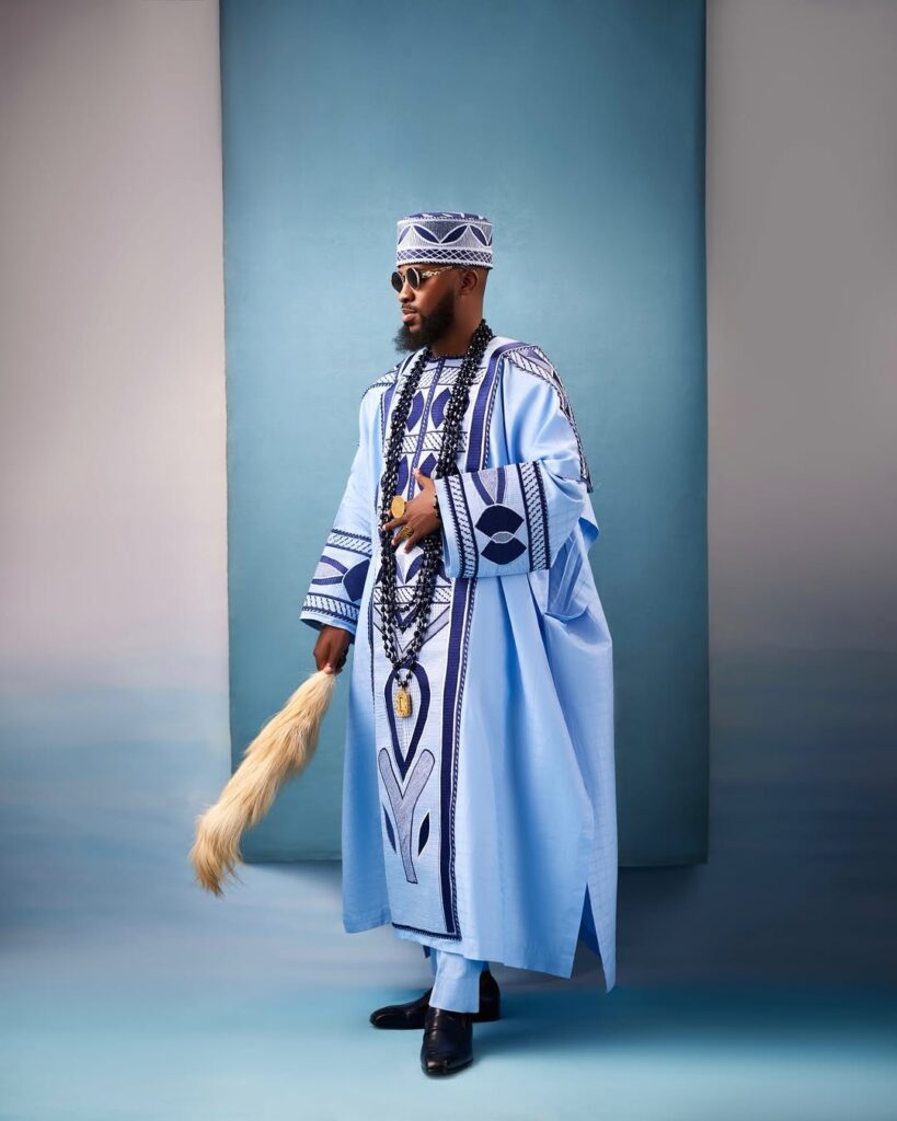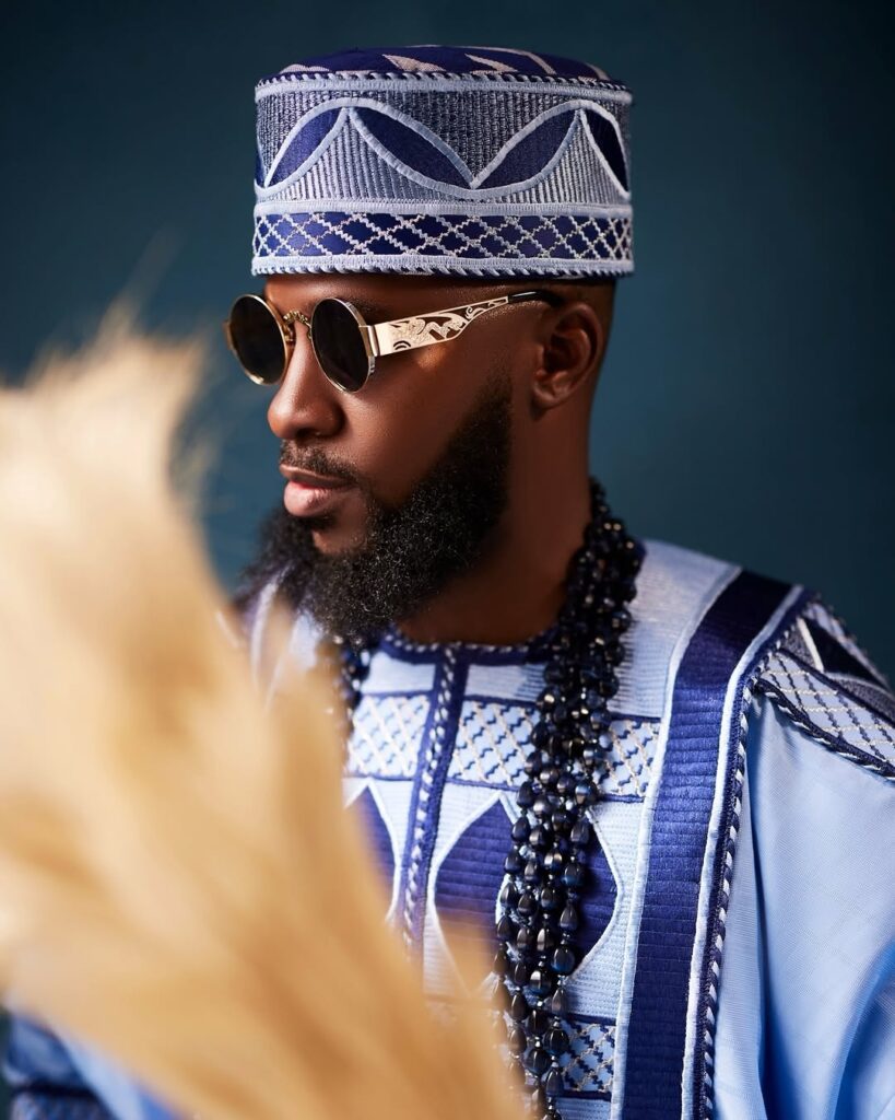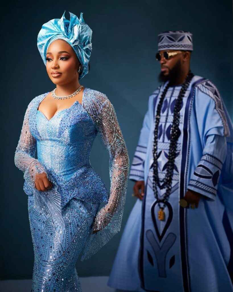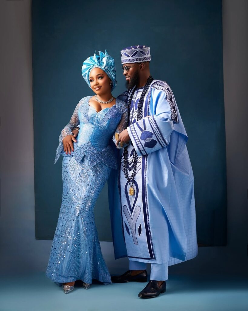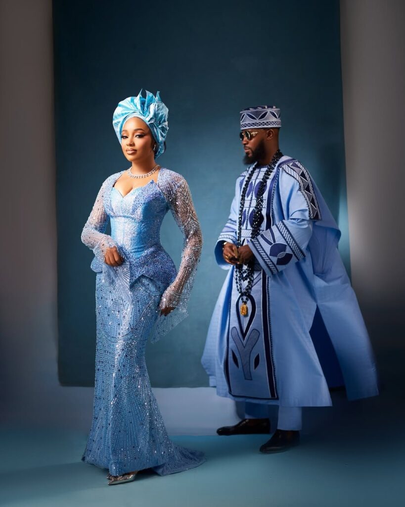 Akin stood beside her wanting simply as sharp in a properly detailed blue agbada. The outfit options daring patterns that stand out properly towards the lighter shade of blue. His matching cap ties the entire conventional look collectively, whereas the lengthy black beads round his neck convey that sturdy cultural presence. He additionally held a horsetail whisk, a chunk that provides much more conventional pleasure to the outfit. The sun shades and polished black footwear give the look a contemporary edge.