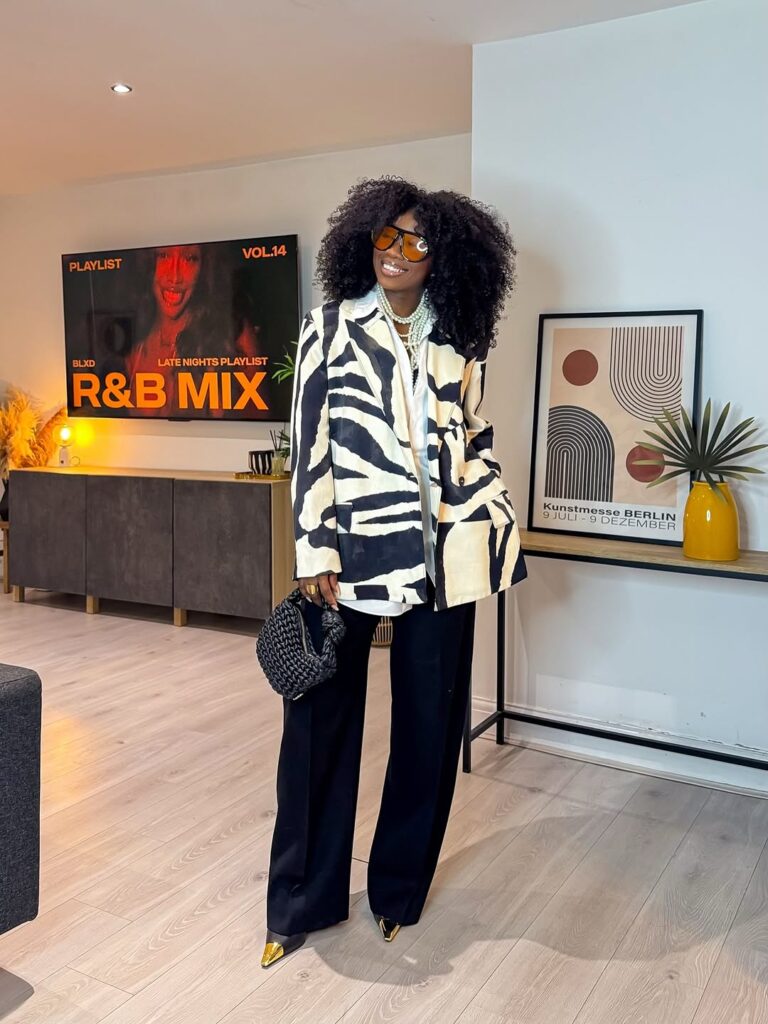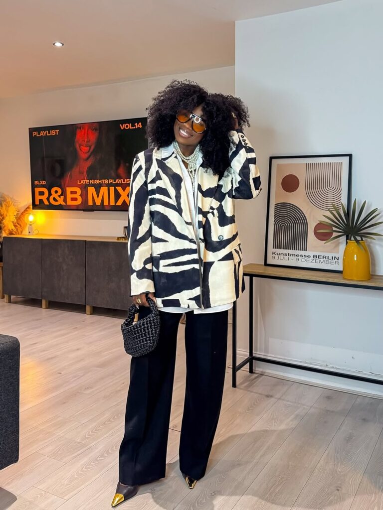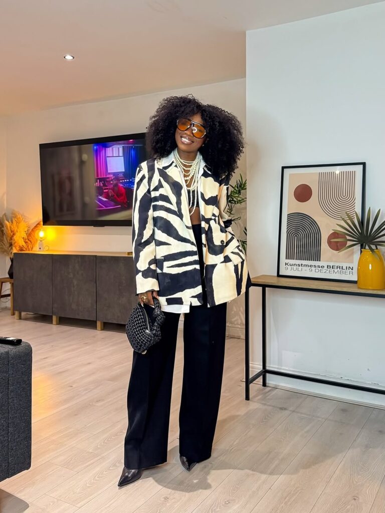 The black and white patterned blazer instantly attracts you in. It’s structured however straightforward, with a print that provides character with out overwhelming the outfit. As a result of the colours keep impartial, the blazer feels wearable, not costume-like. It’s the sort of piece that carries the whole look without having additional effort.